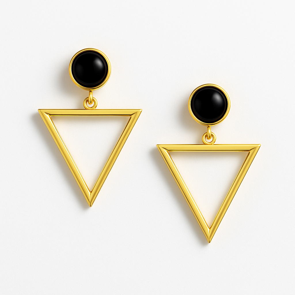 These statement earrings feature a striking triangular drop suspended from a glossy black enamel stud, all set in a sleek 925 sterling silver frame with radiant gold-tone plating. The contrast of sharp lines with circular softness creates a contemporary look that stands out. Lightweight yet impactful, they’re the perfect mix of minimalism and drama.