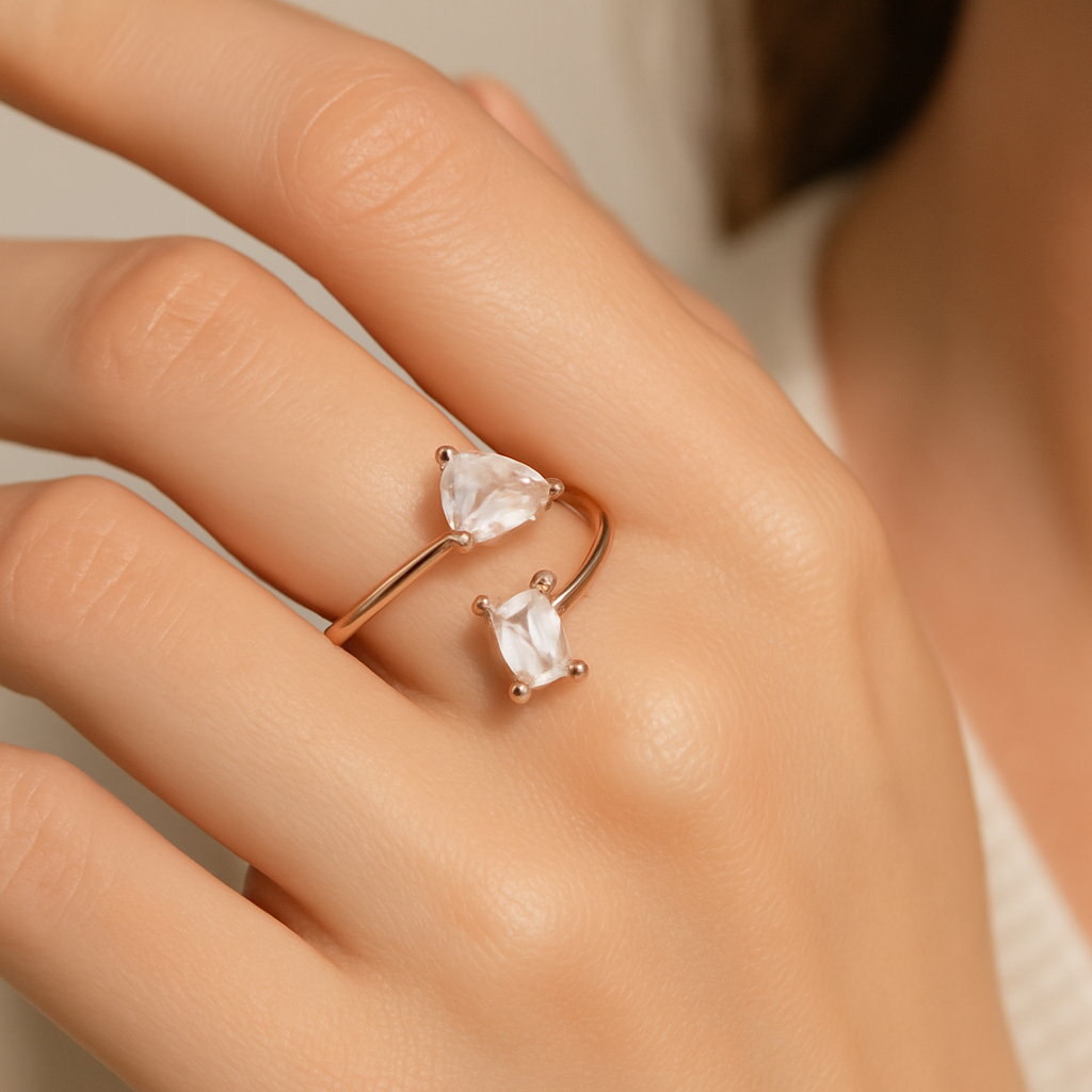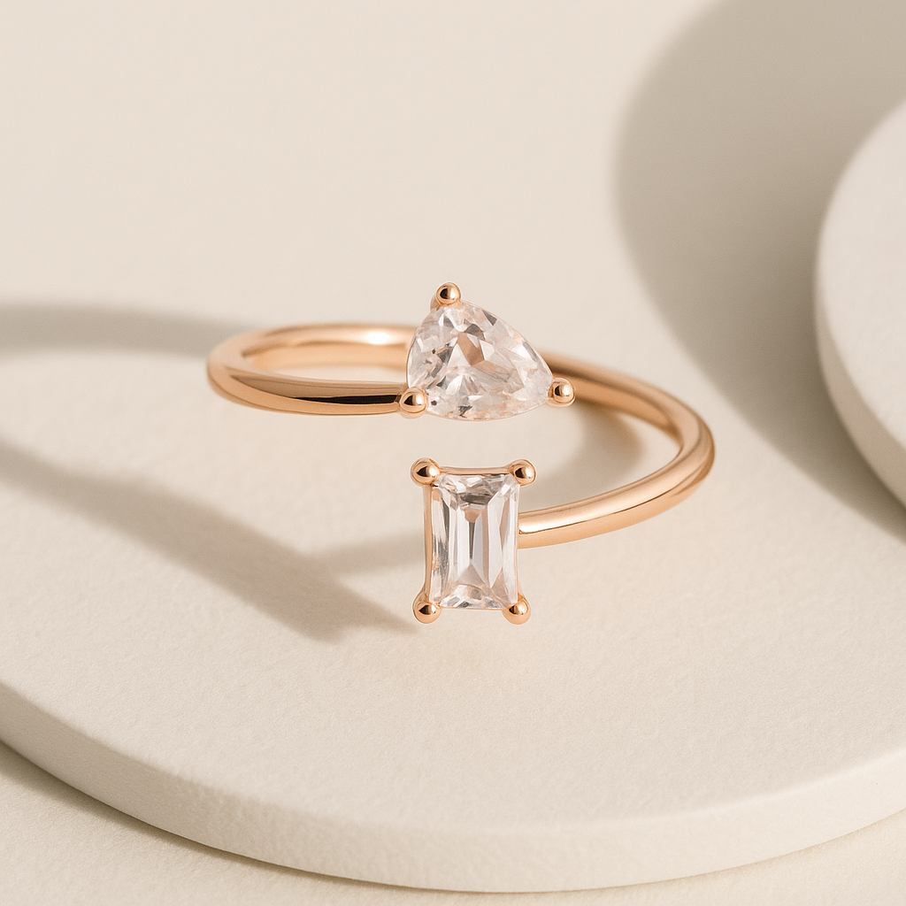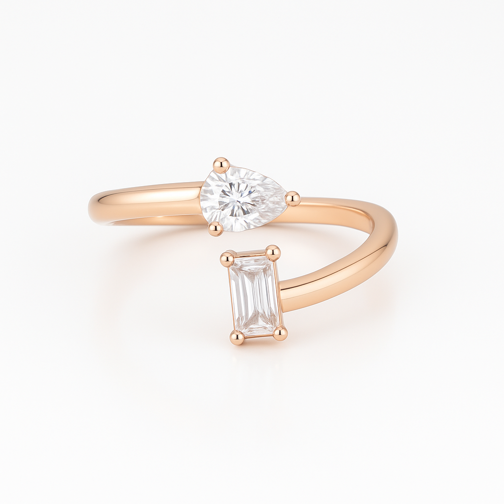This is a Incredible Prestige. It showcases an elegant, twisted bypass design in a rose gold band, with two distinctive gemstones on each end: one side features a classic emerald-cut stone, while the other displays a pear-shaped stone. The asymmetrical pairing of these shapes gives the ring a contemporary and sophisticated appeal, blending classic elements with a modern twist. This piece would be ideal for someone who appreciates unique, artistic jewelry that stands out with a sleek and minimalist profile.