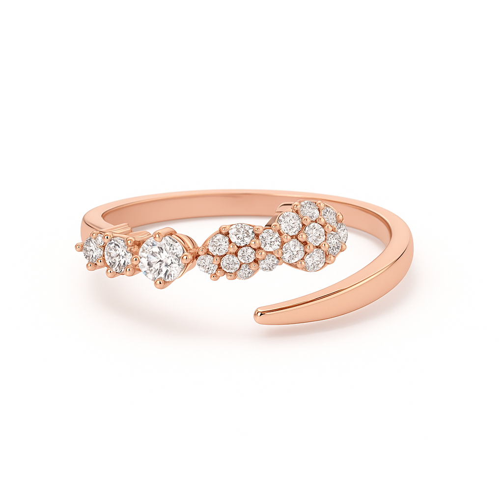 This is a Stellar Serpent Ring. It features an open band with a unique design: one side displays a series of small, flower-like clusters adorned with brilliant cubic zirconia stones, while the other end has a simple, sleek rose gold tip that wraps elegantly around the finger. The ring combines a delicate floral motif with modern minimalist styling, making it both graceful and versatile. This piece is perfect for someone who loves feminine, understated elegance with a touch of sparkle.